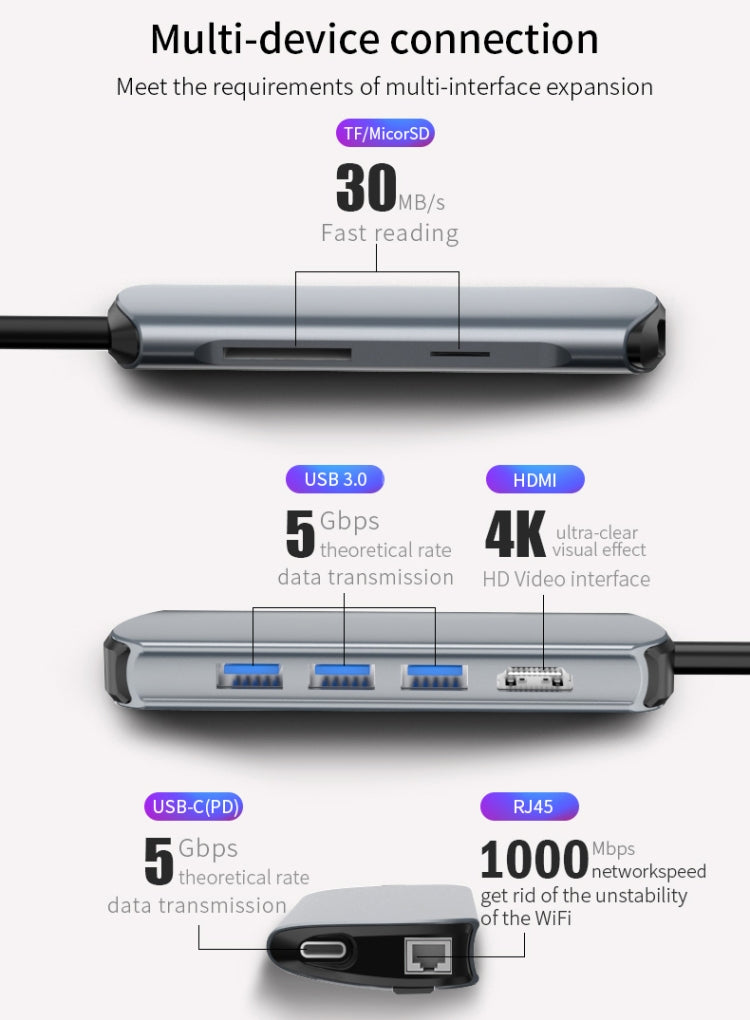 3. Interface type: type-c to USB3.0*3,USB-C*1,SD*1,TF*1,SD*1,HDMI*1,RJ45*1