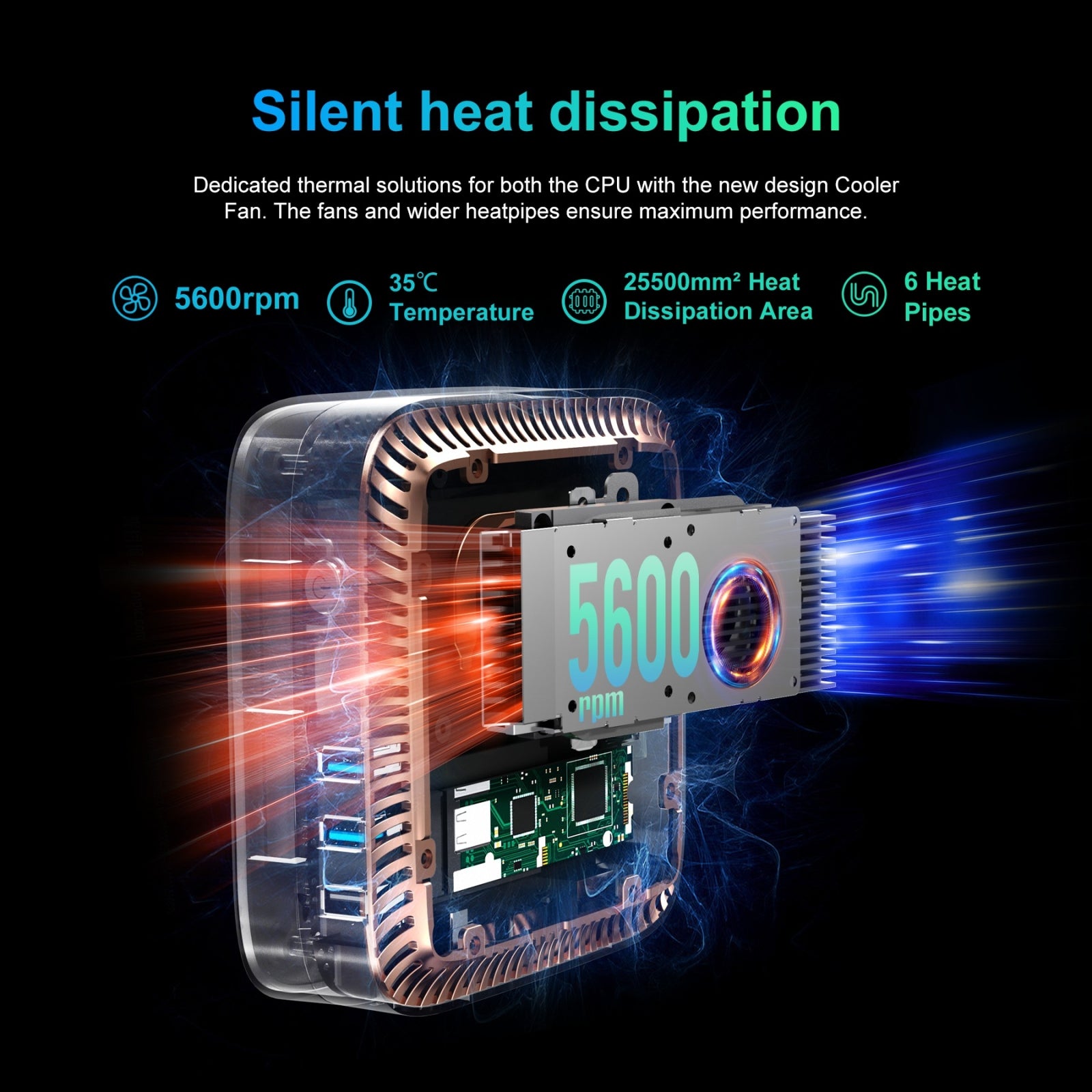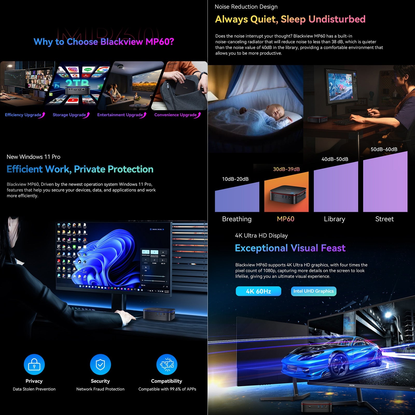 4. Strengthen Your Workspace: MP60 designed with USB 2.0 x 2, USB 3.0 x 2, 4K HDMI x 2, Gigabit Ethernet port x 1, DC Jack x 1, 3.5mm Audio-in/out Jack x 1 and 2.4G+5.0G dual band WiFi, Bluetooth. It is easy to connect multiple Bluetooth like the headset, mouse, keyboard etc at the same time. Gigabit Ethernet port provides ultra-high-speed network, extremely fast download and upload files, refuse to wait. It can work with monitoring equipment, office equipment, monitor, projector, TV and so on.