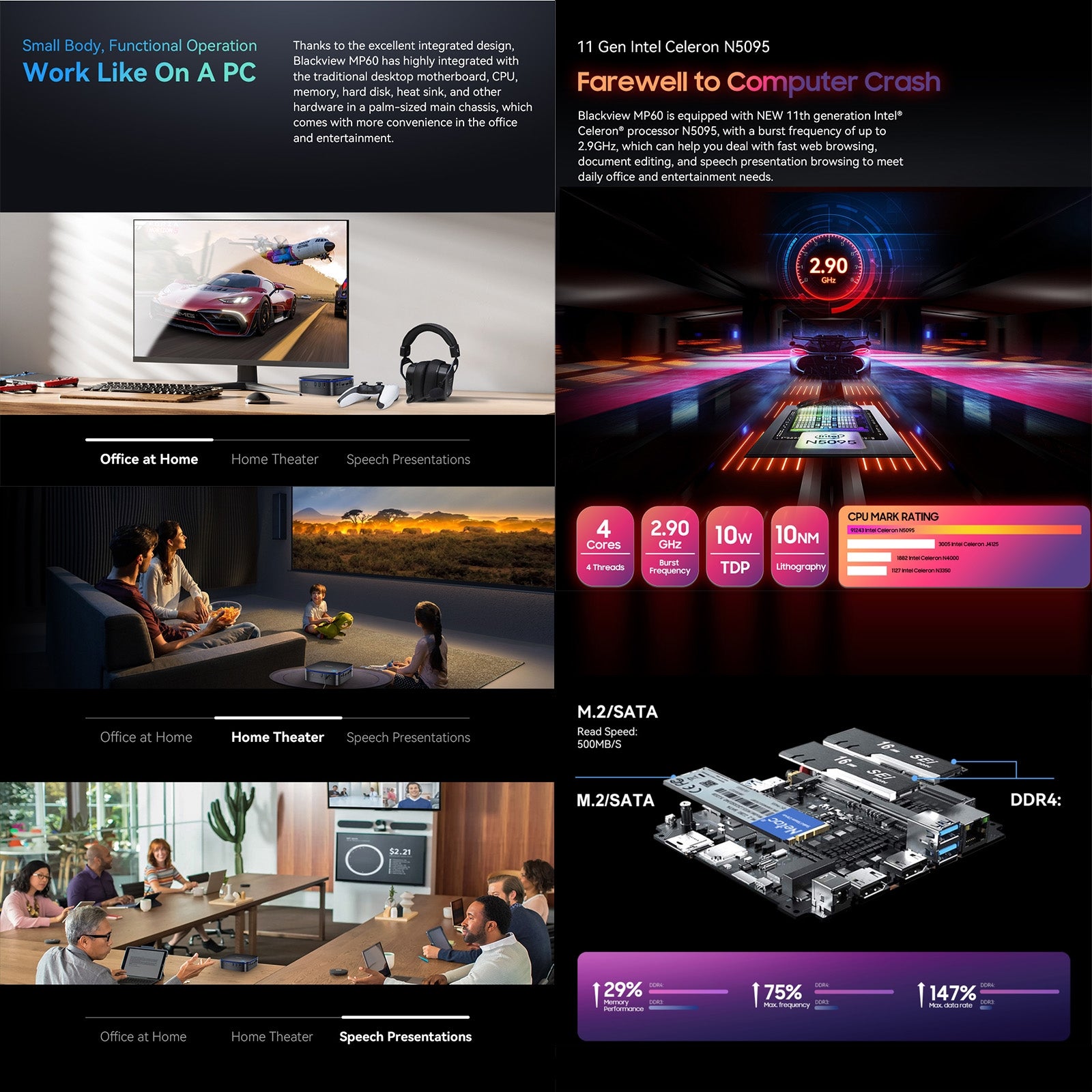 2. Powerful Intel 11th Gen N5095: Blackview mini computers adopts Intel Celeron Processor N5095 (base frequency 2.0GHz, up to 2.9 GHz), with Windows 11 Pro operation system and 4K Intel UHD Graphics handles like browsing internet, reading email, editing documents, home office, and more with ease, even for professional uses like photos editing, with a user experience close to a desktop computer.