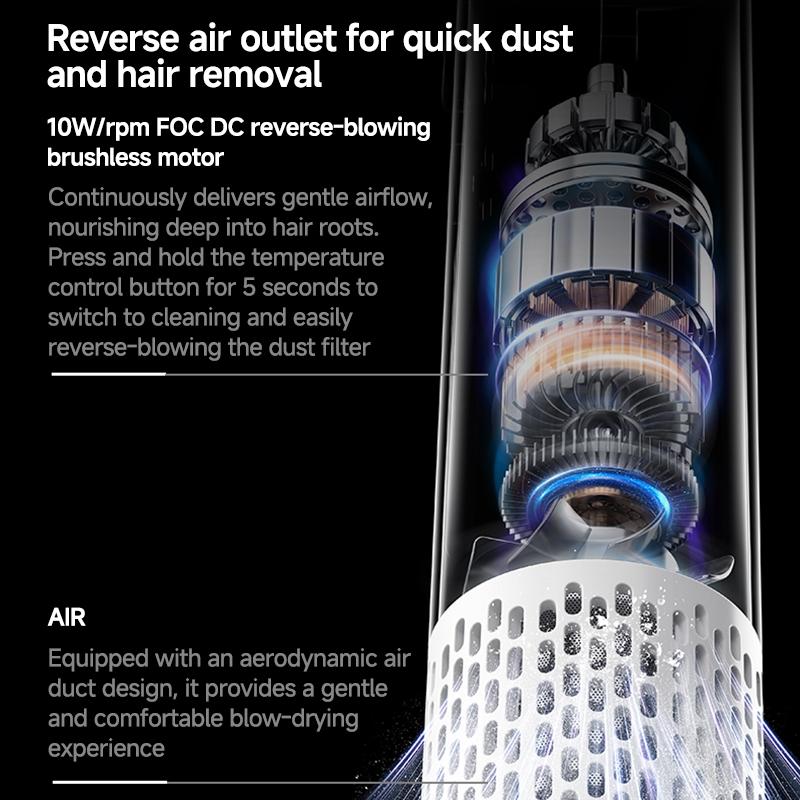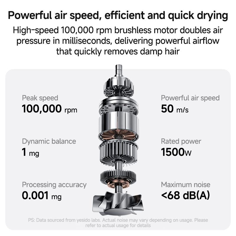 1. 100,000 RPM brushless motor, powerful airflow for fast hair drying in approximately 60 seconds.